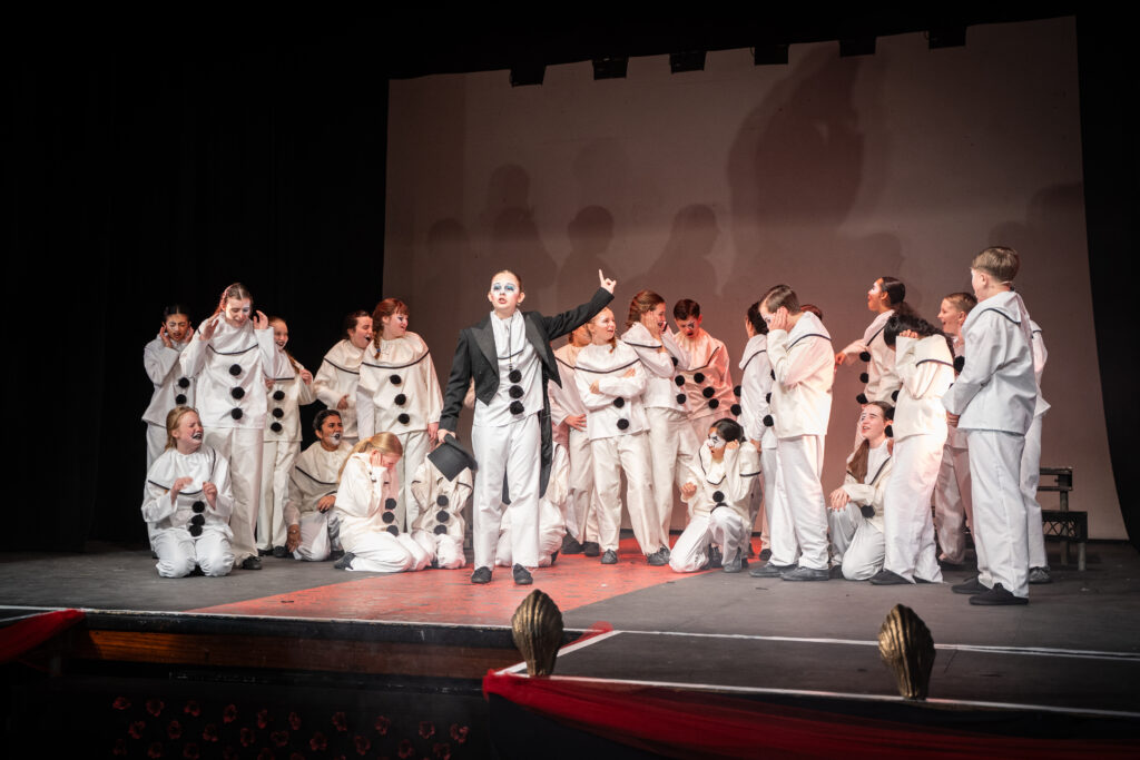 The technical team played a vital role in the success of the evening. Oscar and Ali delivered excellent lighting design, while Emerson and Martha ensured sound was clear and impactful throughout. Maisie and Poppy’s work on hair and make-up was exceptional, helping to create a visually cohesive ensemble. The backstage team: Ben, Natalie, Toby, Ruaraidh, and Lizzie – led by school technician and former pupil Albi – worked tirelessly to ensure smooth transitions. Kathryn’s costume support was outstanding; the costumes were truly impressive and must have taken considerable time and care to source and create. Special recognition must also go to the musicians, Ben and Louis, whose contributions elevated the production. Louis’s on-stage performance of “The Last Post” was particularly moving, offering a poignant moment of reflection for the audience.